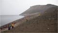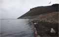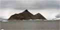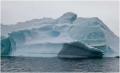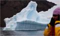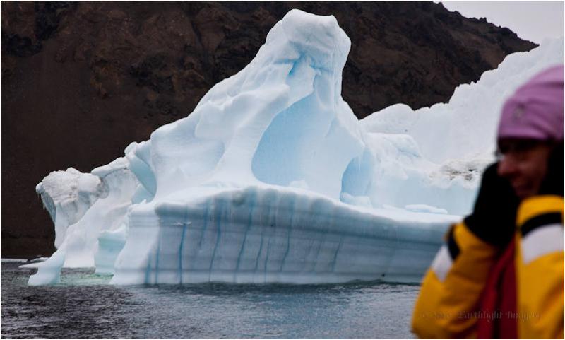 Jenny Clark keeping her ears warm as we ride a zodiac past a wave sculpted iceberg to Devil Island, an island of the Antarctic Peninsula, Antarctica. Deep ice in icebergs can be quite blue, the color not being a reflection of the sea. Canon 1DsM3 with 24-105 lens. 105mm, f/8, 1/640s, ISO 400, 01-20-09.