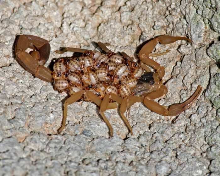 Female Striped Bark Scorpion (Centruoides vittatus) carrying her brood on her back. She'd been lurking under a cinder block out by the driveway into waterstone. The shot was made with a Canon 1Ds Mark III using a 300mm lens with a 2x teleconverter and forced flash. Exposure was manual, set at f/18, 250s, ISO 400